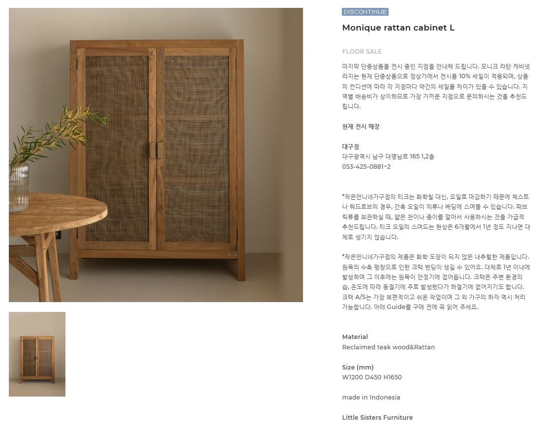 참고로 위 사진은 대구점 쇼룸에 마지막 주인을 기다리고 있는 모니크 라탄 캐비넷 라지 제품의 모습인데요.